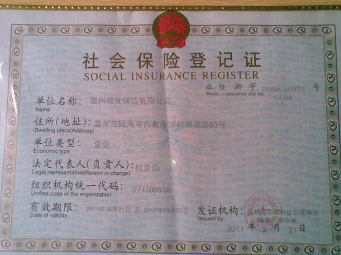 順發(fā)保潔社會保障登記證書